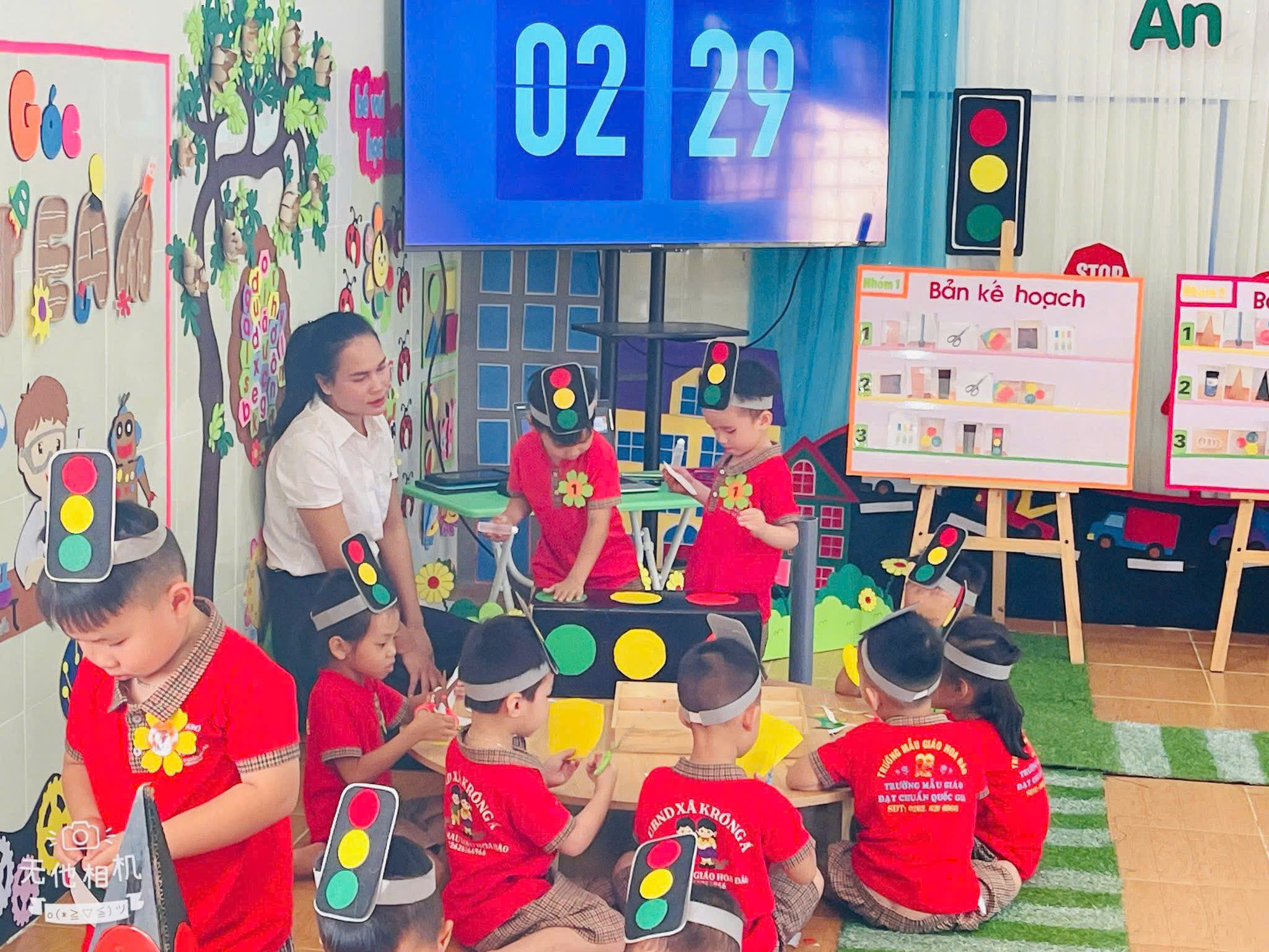 Hoạt động 1: Đặt vấn đề (Ask): Trẻ được quan sát video tình huống giao thông tại khu vực nông thôn (được xây dựng bằng công nghệ AI) khi ngã tư không có đèn tín hiệu, các phương tiện di chuyển lộn xộn, dễ xảy ra va chạm. Từ đó, giáo viên gợi mở để trẻ suy nghĩ, thảo luận và đưa ra các giải pháp khác nhau. Cô và trẻ cùng thống nhất nhiệm vụ “làm đèn tín hiệu giao thông”, đồng thời xác định 3 tiêu chí của sản phẩm: có đủ 3 màu (đỏ, vàng, xanh), màu sắc rõ ràng, dễ nhận biết và sản phẩm đứng vững, sử dụng được.