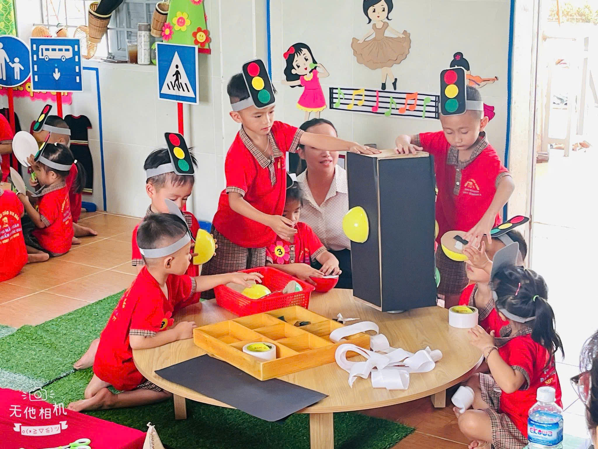 Hoạt động 4: Chế tạo sản phẩm (Create): Trẻ tiến hành làm đèn tín hiệu giao thông dựa trên kế hoạch đã xây dựng. Các nhóm biết phân công nhiệm vụ, phối hợp thực hiện các công đoạn, sử dụng linh hoạt các nguyên vật liệu sẵn có. Hoạt động thể hiện rõ sự khéo léo, sáng tạo của trẻ, đồng thời rèn luyện kỹ năng thực hành, tinh thần hợp tác và khả năng giải quyết vấn đề.